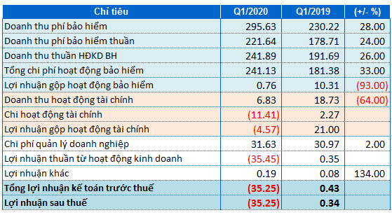 Kết thúc quý I/2020, doanh thu thuần hoạt động kinh doanh bảo hiểm tăng 26%, đạt gần 242 tỷ đồng. Tuy nhiên, công ty ghi nhận tổng chi phí hoạt động kinh doanh bảo hiểm tăng 33% lên hơn 241 tỷ đồng. Do đó, lợi nhuận gộp hoạt động bảo hiểm giảm đến 93% so vời cùng kỳ, chỉ còn 757 triệu đồng.