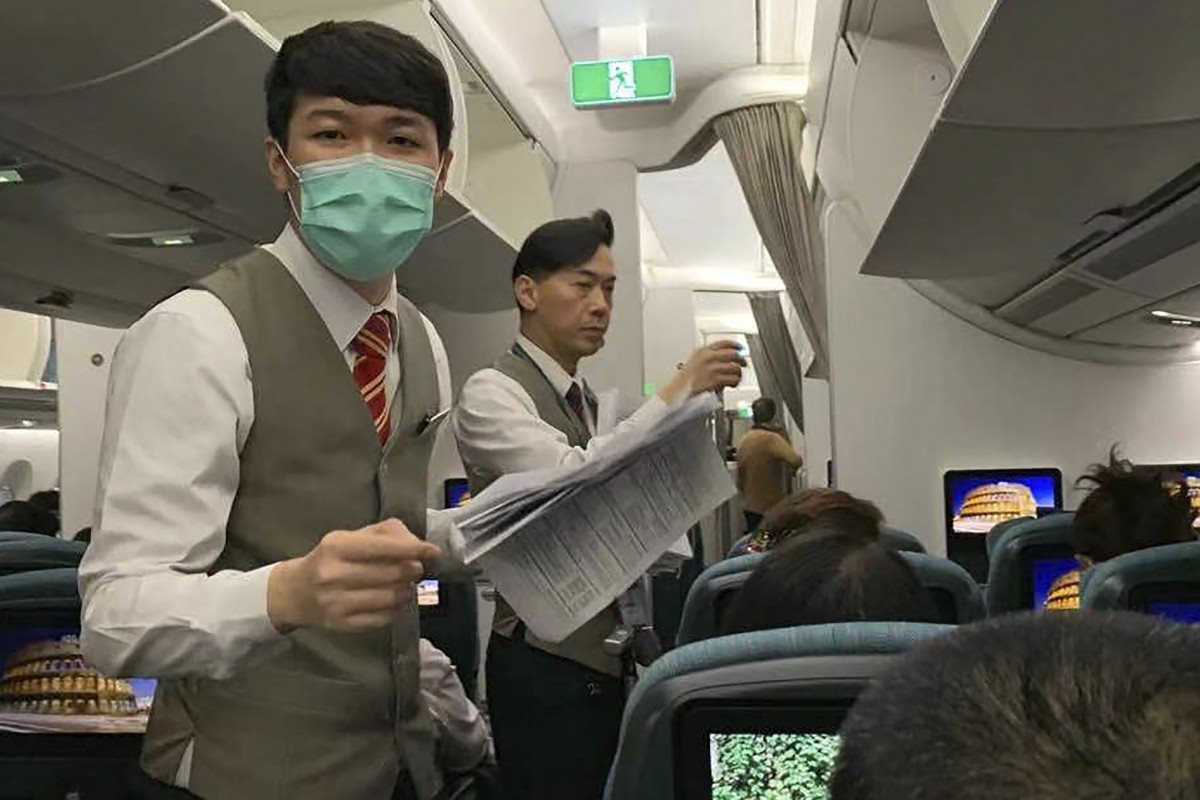 Tiếp viên cung cấp phiếu sức khỏe cho hành khách trên tuyến Hong Kong – Roma của Cathay. Ảnh: AP