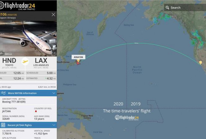 Chuyến bay cất cánh ngay sau khi đồng hồ điểm 0h ngày 1/1/2020, và dự kiến sẽ hạ cánh vào ngày 31/12/2019.