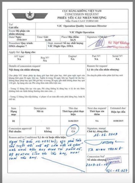 Ngày 26-6, trên mạng xã hội lan truyền hình ảnh về văn bản “Phiếu yêu cầu nhân nhượng” của hãng hàng không VietJet, bên dưới có chữ ký phê chuẩn của đại diện Cục Hàng không Việt Nam đề ngày 15-6. Dư luận cho rằng nội dung xin nhân nhượng của VietJet trái với quy định của Tổ chức Hàng không dân dụng quốc tế (ICAO), quy định của Việt Nam và thông lệ quốc tế.