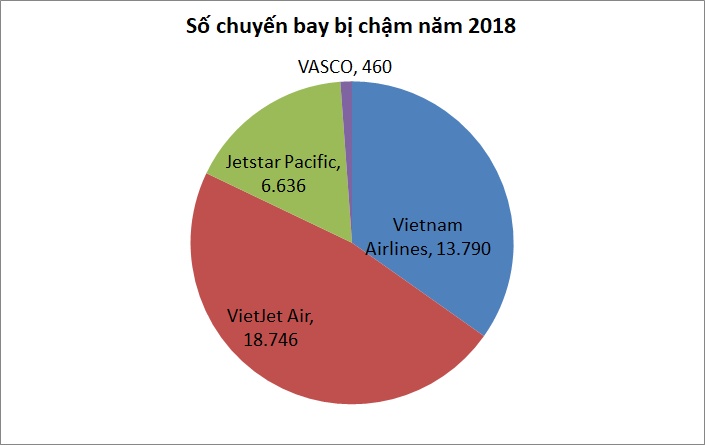 Vietnam Airlines có 13.790 chuyến bị chậm, chiếm 10,8% số chuyến hãng này khai thác. Jetstar Pacific có 6.636 chuyến chậm, chiếm 18,5% chuyến hãng này khai thác. Vasco đứng cuối cả về số lượng và tỉ lệ chậm chuyến với giá trị lần lượt là 460 chuyến và 3,4%.