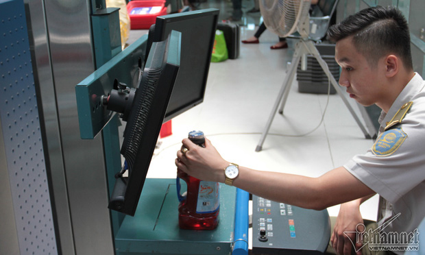 Theo nhân viên an ninh Trần Xuân Hùng, mới đây, có hai vợ chồng ngoài 50 tuổi mang hành lý qua cổng soi chiếu thì bị phát hiện bên trong có 2 chai chất lỏng.