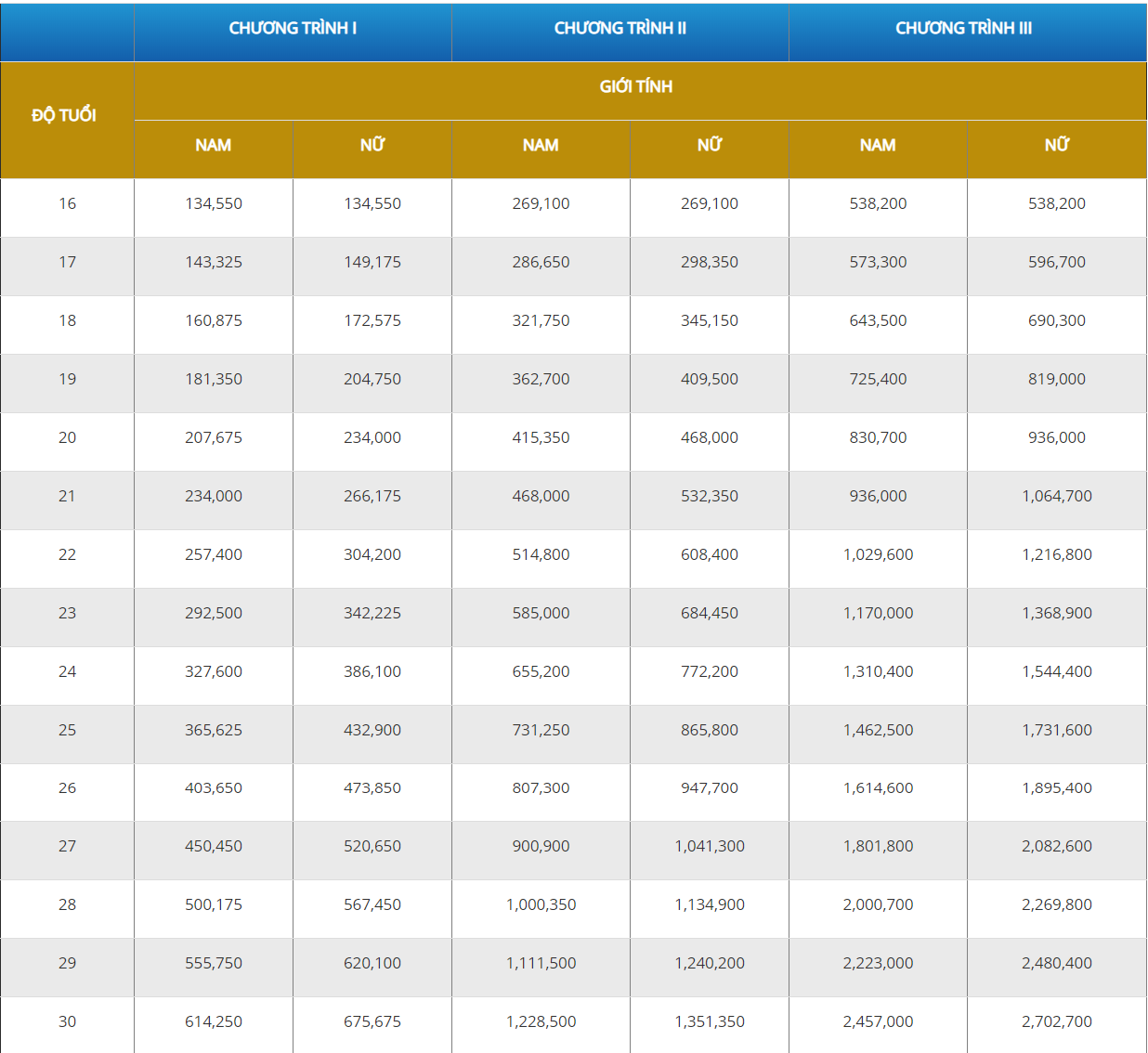 – Phí bảo hiểm: Tính theo độ tuổi và áp dụng cùng khung tỷ lệ phí theo định kỳ 5 năm.