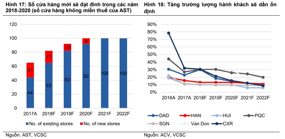 Hoạt động bán lẻ tại sân bay hiện chiếm 60%-70% doanh thu và lợi nhuận gộp của AST. VCSC dự báo sẽ có 35 cửa hàng không miễn thuế được mở trong các năm 2018-2020, qua đó tăng số cửa hàng thêm 53% so với cuối năm 2017.