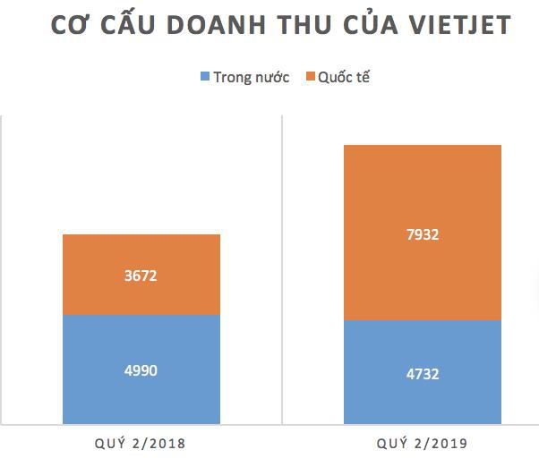 Mổ xẻ số liệu kết quả kinh doanh của Vietjet để tìm lý do hãng hàng không này tiếp đà tăng trưởng mạnh mẽ thị trường quốc tế bên cạnh vị trí số 1 thị phần nội địa. Số liệu cho thấy doanh thu quốc tế quý 2 của Vietjet đạt 7.932 tỷ đồng, xấp xỉ tổng doanh thu của quý 2/2018, chiếm 62,6% tổng doanh thu trong khi cùng kỳ năm trước doanh thu quốc tế chỉ đạt 42,4%.