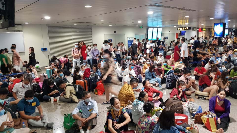 Hành khách tại Tân Sơn Nhất mệt mỏi vì các chuyến bay bị chậm và huỷ chuyến do sự cố máy bay trượt khỏi đường băng. Ảnh: Dân Việt