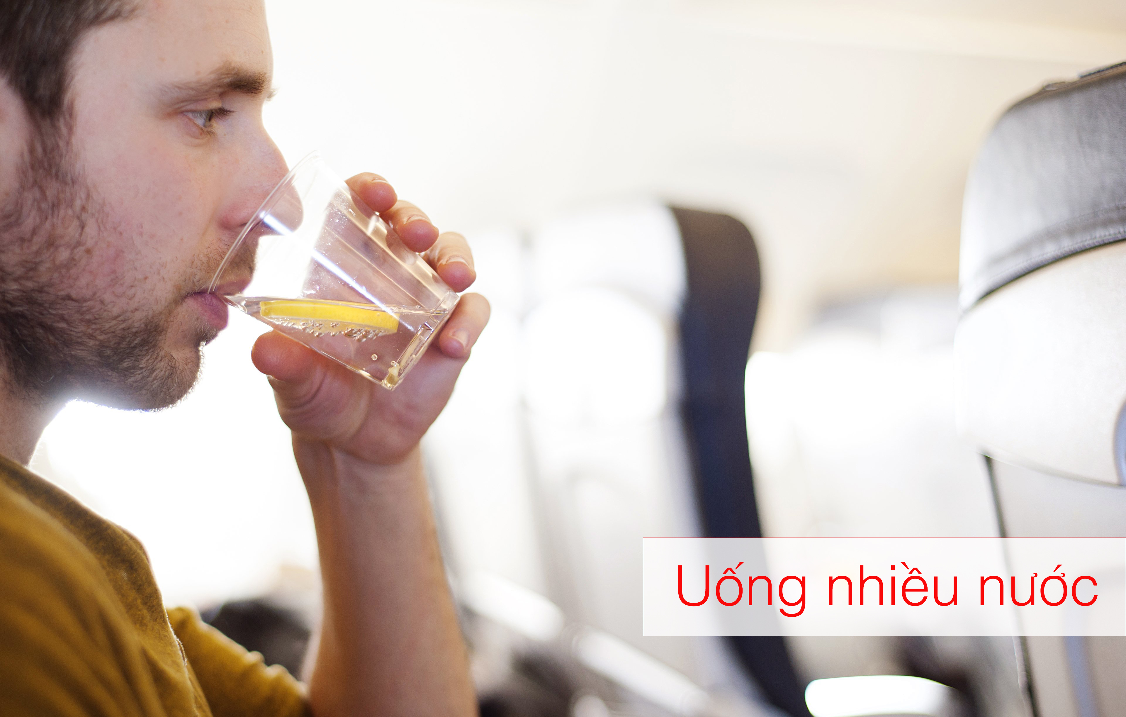 Bạn nên một ít nước trước khi bay và trong lúc trên máy bay. Việc thay đổi áp suất không khí sẽ khiến bạn cảm thấy khát nước. Nên bổ sung đầy đủ nước cho cơ thể để tránh làm bạn mệt mỏi hơn.