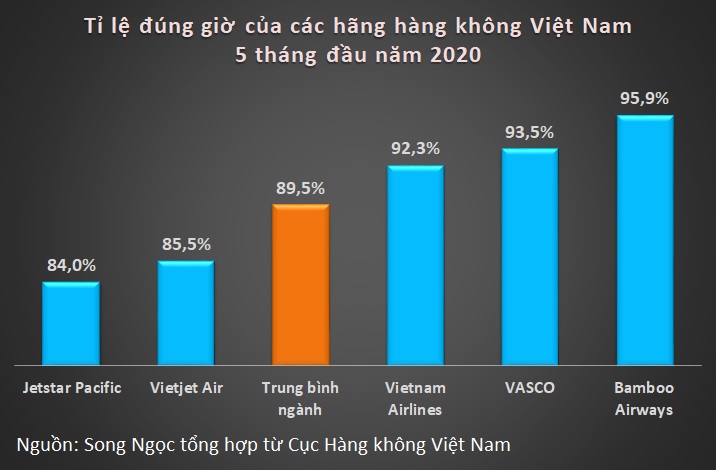 Trung bình 5 hãng hàng không Vietnam Airlines, Vietjet Air, Jetstar Pacific, Bamboo Airways và Vasco, tỉ lệ cất cánh đúng giờ trong 5 tháng đầu năm nay là 89,5%.