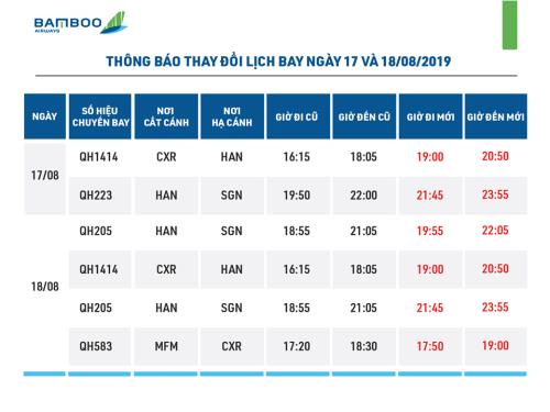 Trong hai ngày 17 và 18/08/2019, do ảnh hưởng từ hoạt động quân sự tại Cam Ranh (Khánh Hòa), Hãng hàng không Bamboo Airways sẽ thực hiện việc điều chỉnh thời gian khai thác của 3 chặng bay.