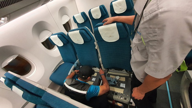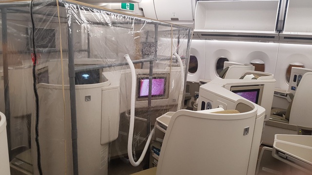 Trên máy bay, hành khách sẽ được chia làm 3 khu vực, ngăn cách bằng các tấm nhựa dẻo PVC. Trong đó khoang thương gia được thiết lập làm “vùng sạch” và được lắp máy lọc không khí đặc chủng của Bộ Y tế. Đây cũng là nơi các y, bác sĩ và thành viên tổ bay ngồi trong suốt chuyến bay.