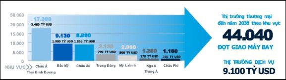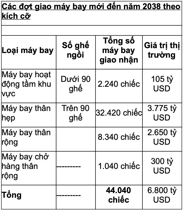 Đội máy bay thương mại toàn cầu cũng sẽ tiếp tục duy trì nhu cầu về dịch vụ hàng không trị giá 9,1 nghìn tỷ USD, giúp thị trường thương mại có khả năng đạt giá trị 16 nghìn tỷ USD cho đến năm 2038.