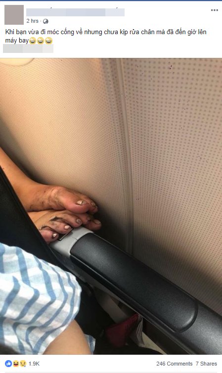 Câu chuyện mới đây của cô gái trẻ C.C. khi phải hứng chịu nỗi kinh hoàng từ “đôi bàn chân vô ý thức” của một hành khách ngồi hàng ghế phía sau ngay lập tức khiến mọi người bất bình. “Khi bạn vừa đi móc cống về nhưng chưa kịp rửa chân mà đã đến giờ lên máy bay. Chúng mày cứu tao.”, tài khoản C.C than vãn trên mạng xã hội.
