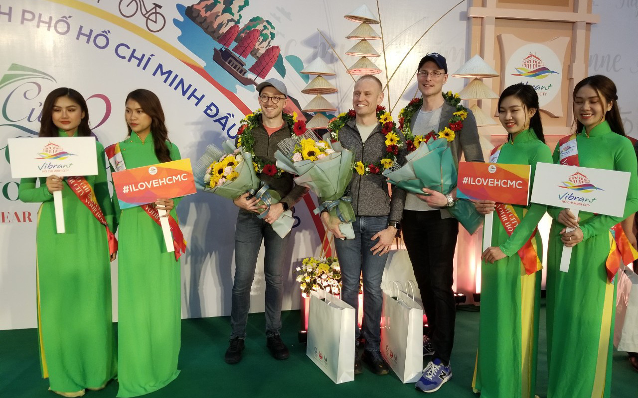 Theo đó, rạng sáng ngày 1/1, đại diện Sở Du lịch TP.HCM cùng Hiệp hội Du lịch TP và các hãng hàng không tổ chức Lễ đón đoàn khách quốc tế đến TP.HCM đầu năm mới 2020. Những vị khách trên các chuyến bay quốc tế JL079 (Hãng Hàng không Japan Airlines từ Nhật Bản) và chuyến bay quốc tế VN2106 (Hãng Hàng không Vietnam Airlines liên doanh với Hãng Hàng không Air France) đến từ Pháp hạ cánh tại Sân bay Quốc tế Tân Sơn Nhất, vinh dự là những người “xông đất” TP.HCM đầu tiên của năm 2020.