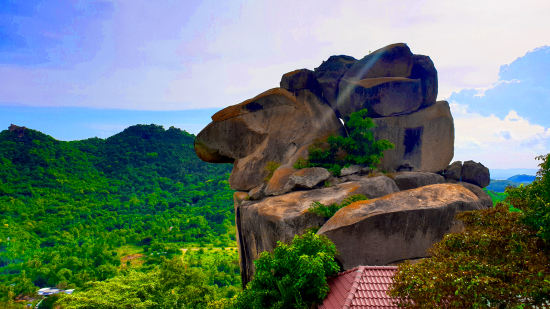 Ngọn núi này có hình khối tròn, cao 225m, dài và rộng hơn 1.100m, được bao bọc bởi những ngọn núi khác như núi Dài, núi Đất, núi Trà Sư, núi Bà Đắc.